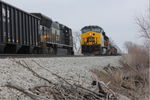WB meets coal mtys with NS power at the east end of Walcott siding, March 28, 2014