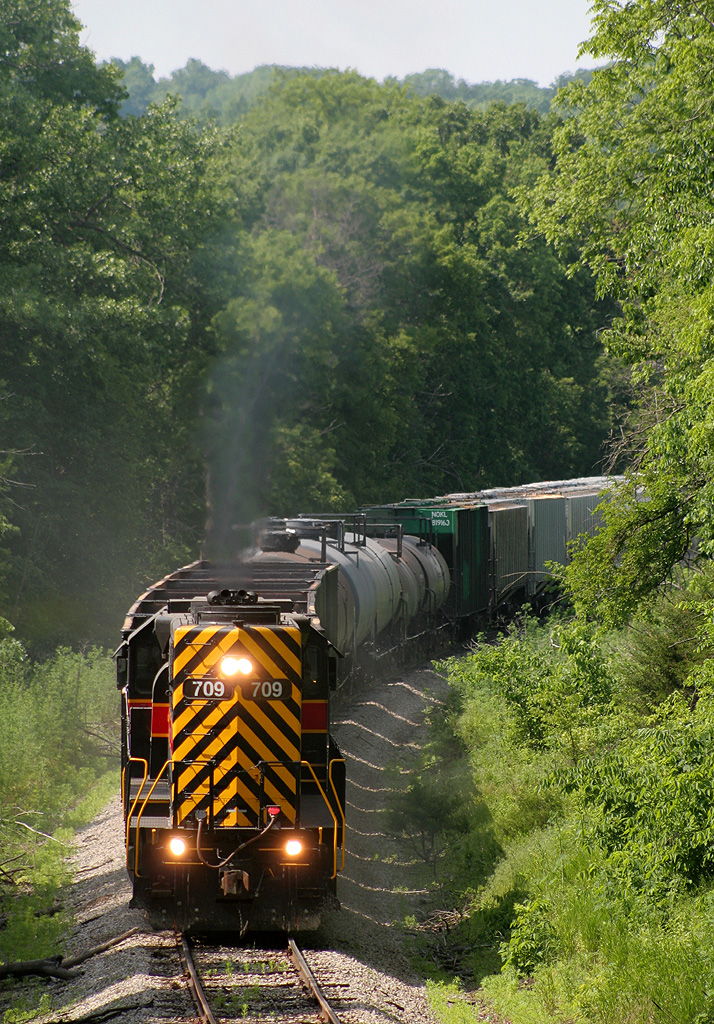 The Rocket struggles up Putnam Hill. The max tonnage for one GP38-2 on the hill is 3100 tons and the 709 made it up the hill with 3106 tons!