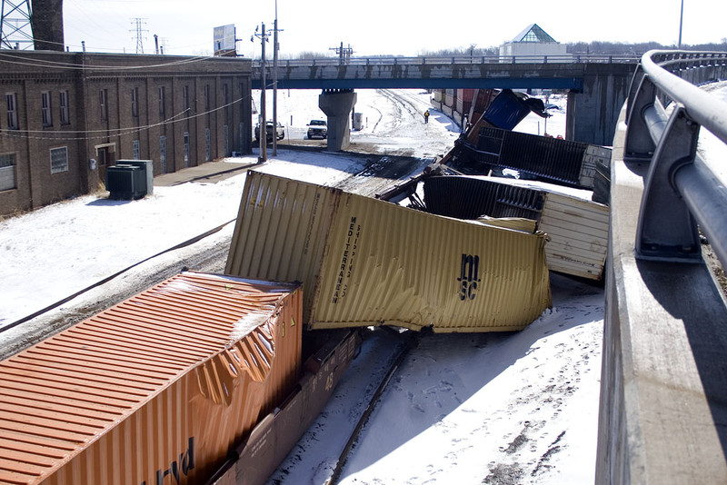 A reverse move gone wrong. While shoving doublestacks under 24th Street in Rock Island, several of them didn't clear the bridge.