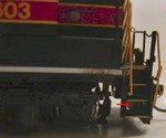 Rear view of 603 showing new pilot plate, shortened 3000g fuel tank and paper air filter and lengthened dynamic brake blister with a Cannon #1805 DB access door. Also visible are the Cannon #1704 radiator fans, #1853 DB fan, fuel tank details, Detail Associates #2211 coupler cut bars, DA #1022 ditch lights with MV #600 lenses, Details West #294 MU hoses and #139 air filter set, as well as the "Work Safely" decals in the stepwell, from the Oddballs Decals IAIS diesel set.