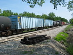 East train heads east on the main. Almost the entire train of 15-20 cars was scrap, with a couple covered hoppers for I think JM.