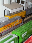 Snap shot over looking benchwork. 30 car unit grian trains will be common on the main line as trains move between Council Bluffs and Salt Lake City.