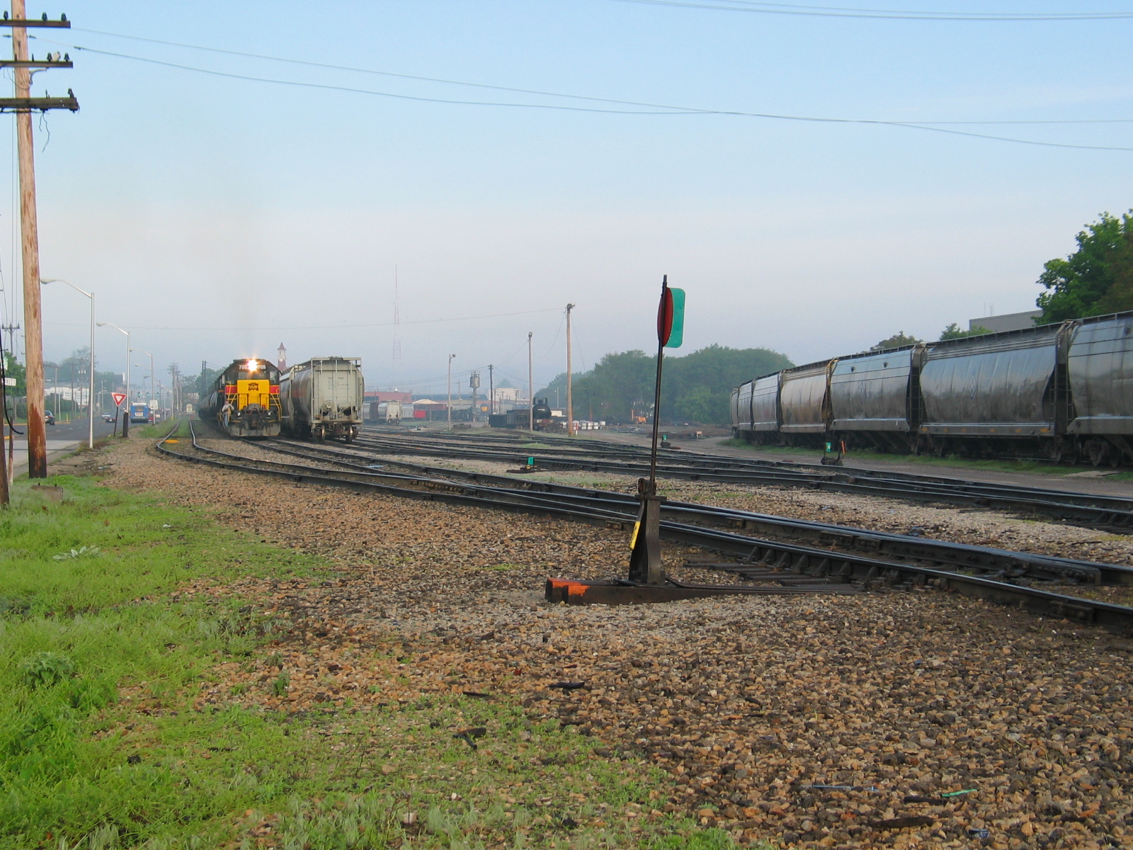 RISW crew has coupled onto the inbound turn and is pulling it around the "Iowa Main." On the right are feed loads on t he "BN pass."