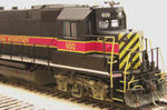 Front view showing extended cab face and cab roof modifications. Barely visible over the engineer's side front window, below the roof extension, is the conduit running out of the cab face and up to the EOT antenna. Note that the horizontal red/yellow stripe is several inches too low, as per the prototype. The standard IAIS scheme has the top yellow stripe falling on the bottom edge of the cab side windows.