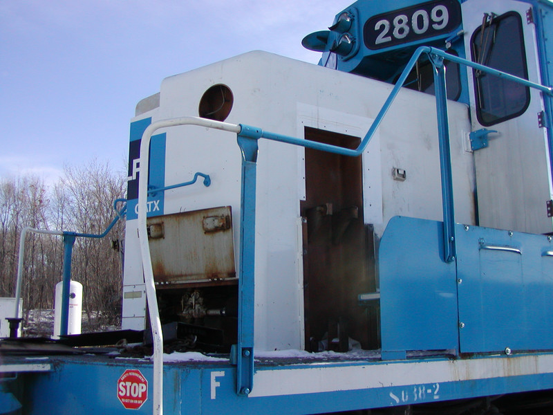 Front Gyralight and front left class light have been removed.  I'm not sure what work is taking place that required removal of the brakewheel housing and access to the sanding valves.  Note new cab door.