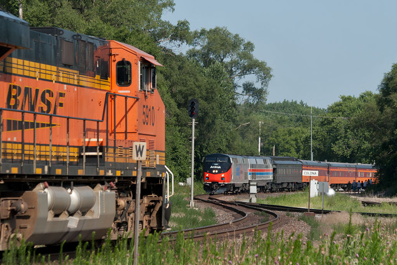 BNSF 5910 has pulled up to the signal and waits for AMTK 156 to enter the IAIS at Colona, IL.