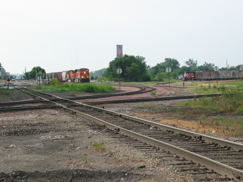 BN train is backing up the Bayard line, in the foreground is IAIS's main, crossing it is BN's Pacific Jct. line, and in the background is CBGR's geep. Council Bluffs, June 21, 2006.