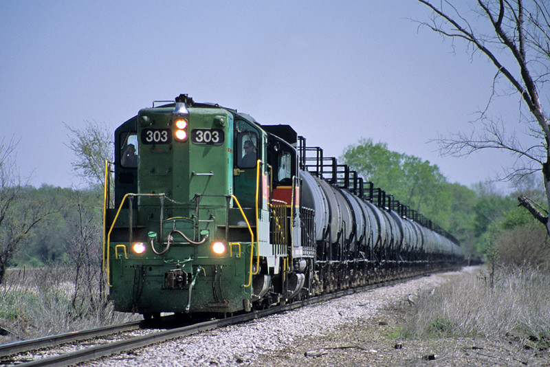 #303 leads a westbound cut of syrup cars at Moscow, Iowa March, 26th, 2004.