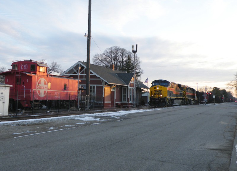 Iowa 512 has the coal train in control as they head back north passed the restored depot and caboose in Chillicothe.