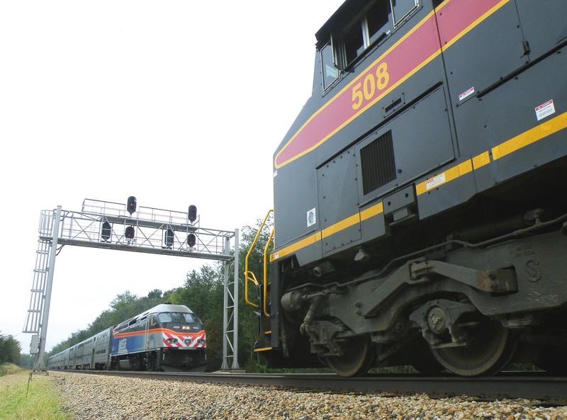 METX 423 scoots by while conductor Vahey gets his blocks to advance eastward for Track 9. 09-18-10