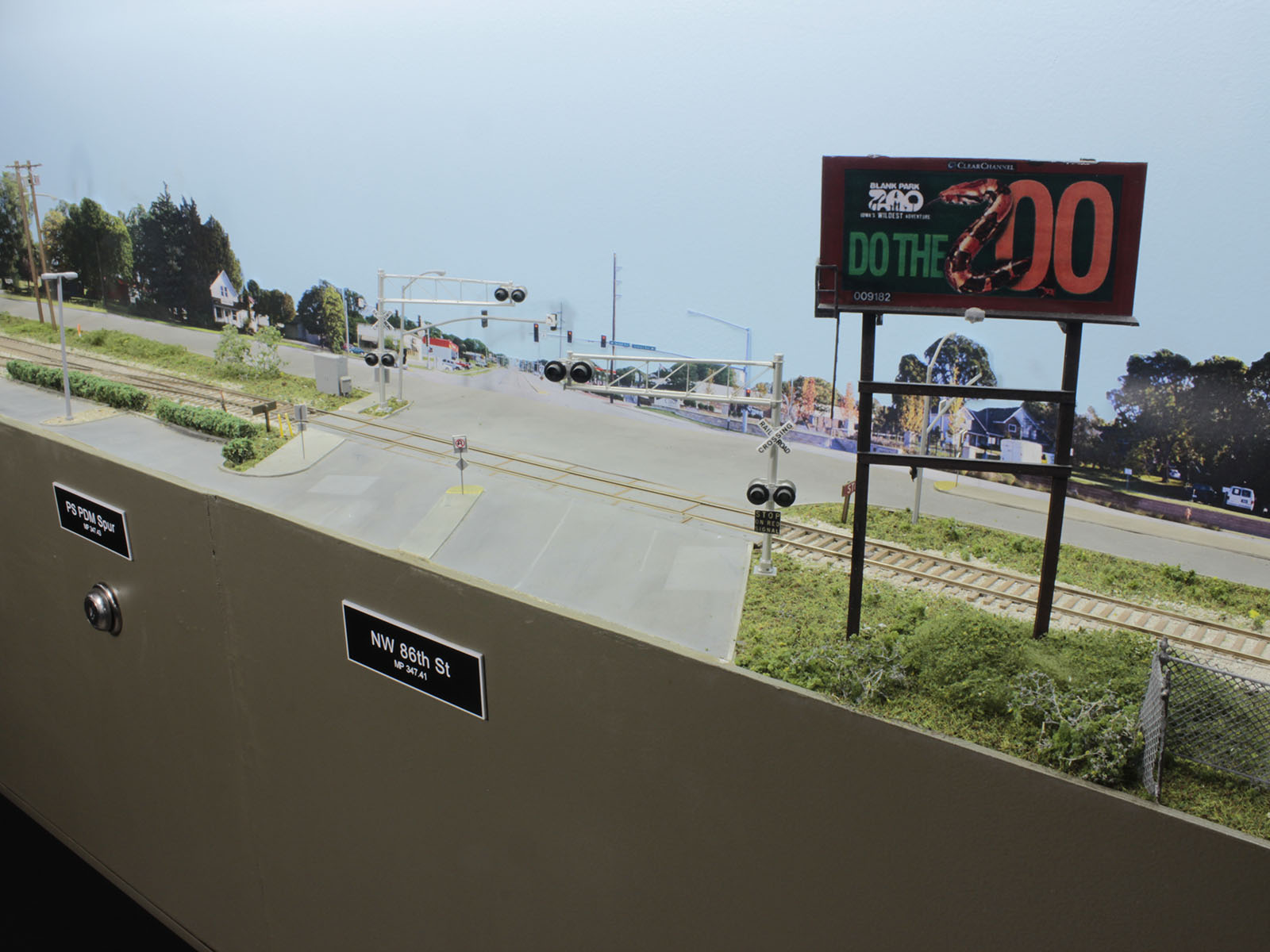 The modeled section begins at NW 86th Street. Stop Boards are located on both sides of the crossing. All trains must come to a complete stop and ensure protection is active before proceeding.