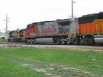 BNSF power heads in at Moline siding, while IAIS 703/713/719 stand by to pick up the train.